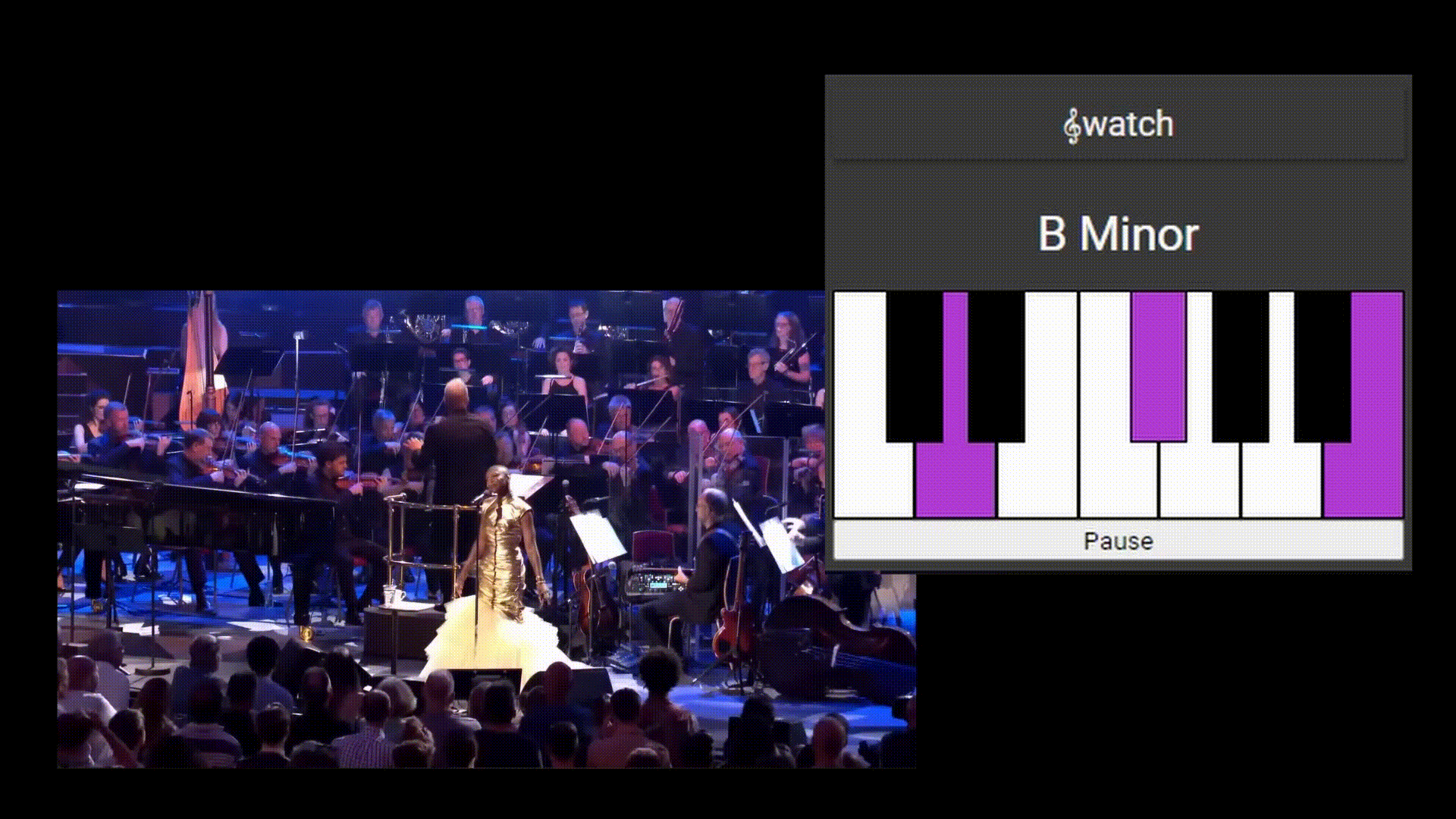 Play music from any audio source on a browser tab, and 𝄞watch will near-instantaneously detect the musical chord for you, whilst also displaying the relevant notes that belong to that chord, so you can easily replicate it! For example, if C Major is detected, then C, E, and G will appear on the on-screen digital piano. Finally, you can also play and pause from within the Chrome extension, avoiding the need to exit the extension view every time you need to pause/play.