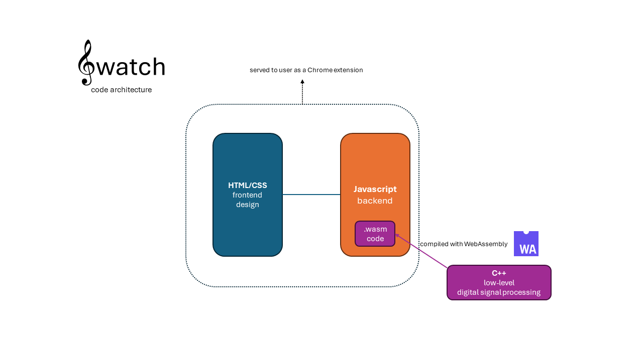 This app was served to the user as a Chrome extension, which by construction uses HTML and CSS for the front-end design, while using Javascript for back-end scripting. Because one of my goals was to optimize the audio digital signal processing in a lower level language (in summary, I perform Fast Fourier Transforms, bin frequencies into chroma, before minimizing similarity to established chord-chroma profiles) - I coded all the backend processing in C++. However, because C++ would traditionally be run in an executable file, I use WebAssembly to transpile C++ into browser-readable assembly code. The Javascript backend calls the .wasm code for compute-intensive tasks, while maintaining the broader averaging functionalities needed to assert more stability in chord detection.