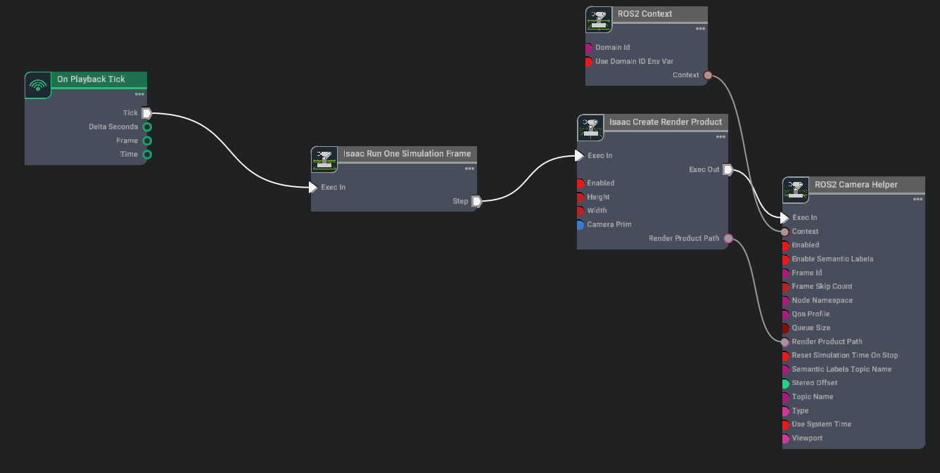 Once we’ve gotten the camera in place, we will next articulate the camera with the goal of getting it to publish image data to the /rgb topic. Create an action graph that looks like the following: