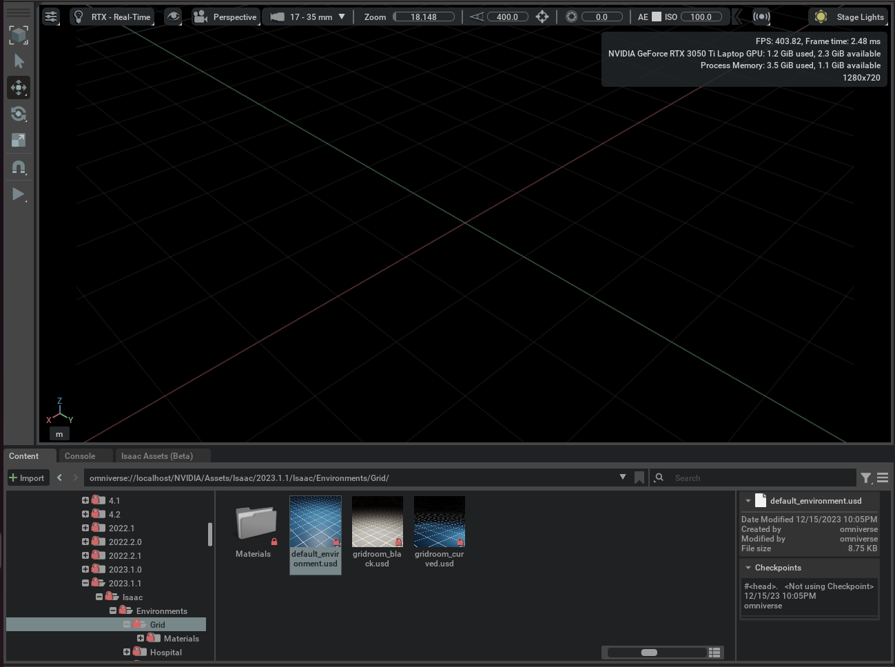 Our robot needs a floor to stand on. If you’ve completed the full workstation installation for Isaac Sim, they provide plenty of environment/human/robot asset templates.