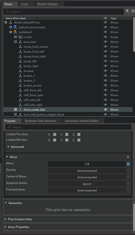 Selecting the turtlebot4 in the sidebar, go to turtlebot4>front_caster_link, and scroll down the bottom right property window, and set Mass to 1.5.