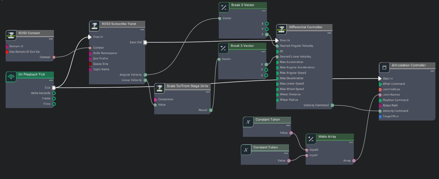 The idea behind the above adjustments is that the Articulation Controller receives a velocity command from a ROS topic, and converts it to an actual physical action with respect to the relevant robot joints.