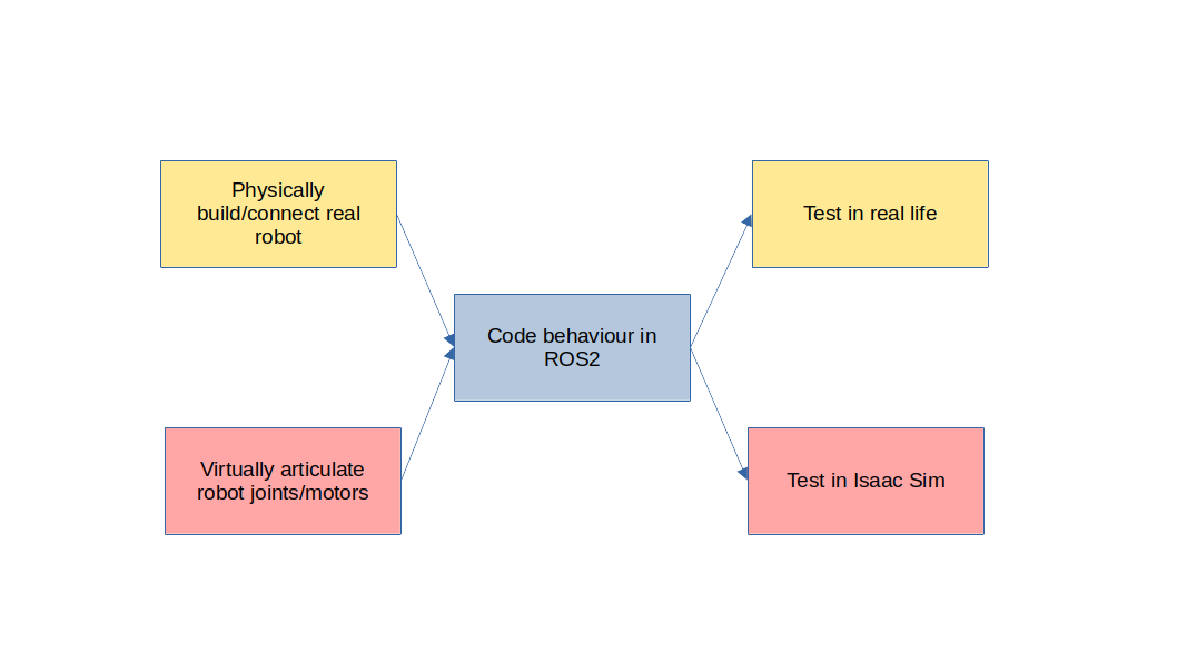 We want to replace real-life articulation and testing in a simulator like Isaac Sim. For our simulated workflow (in red), we must (1) virtually articulate our robots’ joints and motors, which is primarily done with a visual scripting tool called Action Graphs, then (2) write our ROS2 code as before to actually program control of the robot, then (3) test run in Isaac Sim. This may require extra steps like designing/importing a digital twin environment or assets like humans.