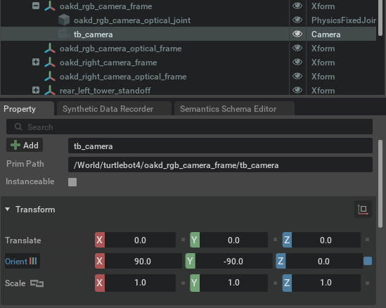 First, create a camera in Isaac Sim by selecing Create > Camera. Then, parent it under oakd_rgb_camera_frame directly. If you’re using a custom robot, I faced quite a bit of problems trying to figure out the correct parent, but just keep going to the camera viewport and checking whether the image looks correct. Also, the camera begins by facing downwards, so to make it face forward you’ll need to change Orient > X = 90 and Orient > Y = -90.